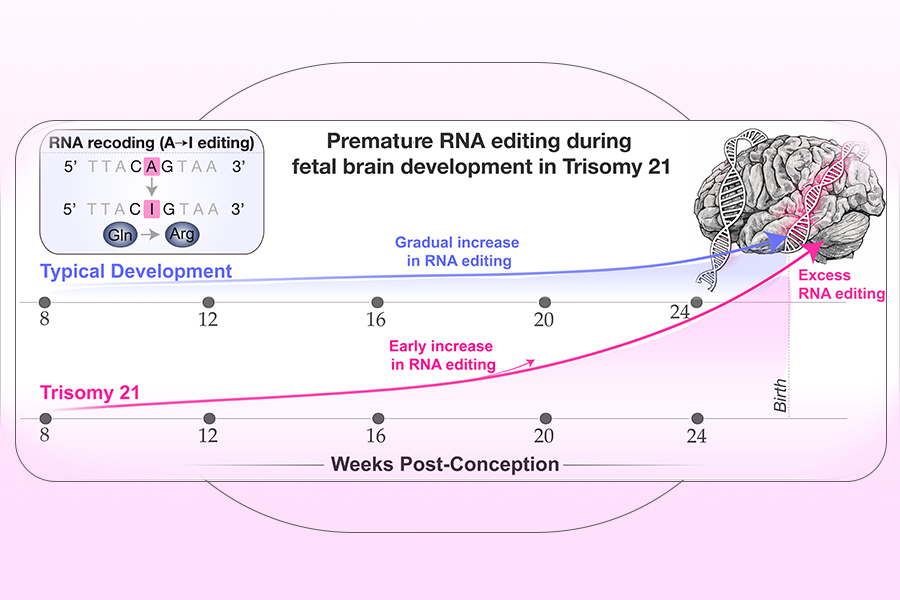 Заключенията, публикувани тази седмица в престижното научно сп. Nature Communications, показват, че излишъкът от ензим за редактиране на РНК, наречен ADARB1 (известен също като ADAR2), причинява твърде ранна и твърде значима промяна на РНК-съобщенията в развиващите се мозъчни клетки на хора със синдром на Даун, като по този начин влияе върху начина, по който мозъчните клетки комуникират и по който се формират невронните мрежи.